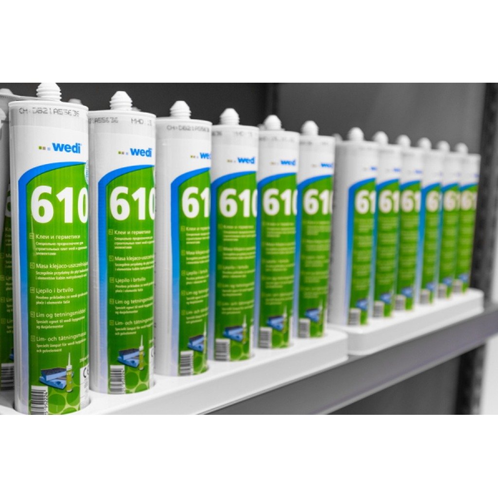 Elastic adhesive sealant for bonding and sealing joints of wedi building boards and other wedi XPS elements in a single step. It offers excellent weather and chemical resistance, is free of solvents, silicon and PCP and has low shrinkage. The adhesive and sealant can be painted according to DIN 52452 part 4.